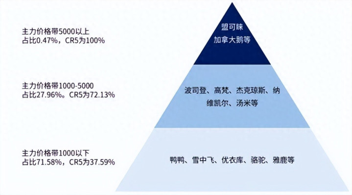 {jz:field.toptypename/}进入2018年,加拿大鹅万元定价进入中国,波司登启动高端转型,更换LOGO,推出登峰系列,主力价位升到1500-2500元。鸭鸭重组后线上GMV从8000万飙到150亿,聘请王一博代言。雅鹿通过84家网店覆盖200-1500元区间,高梵则从合肥迁杭州,专注鹅绒,砍掉鸭绒线。森马推出高洁净1000+产品,海澜之家强调95%绒子含量。波司登投资德国博格纳,但子品牌在中国培育慢。市场开始分层,波司登中高端稳固,但高梵黑金系列抢占线下高端商圈。