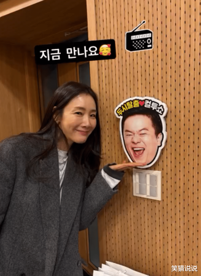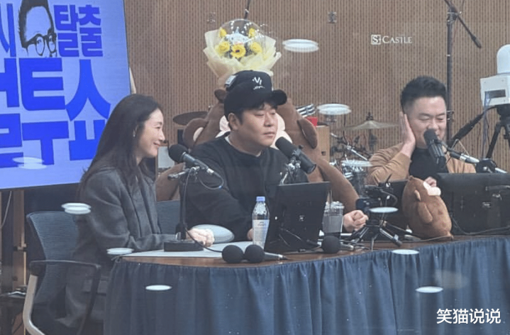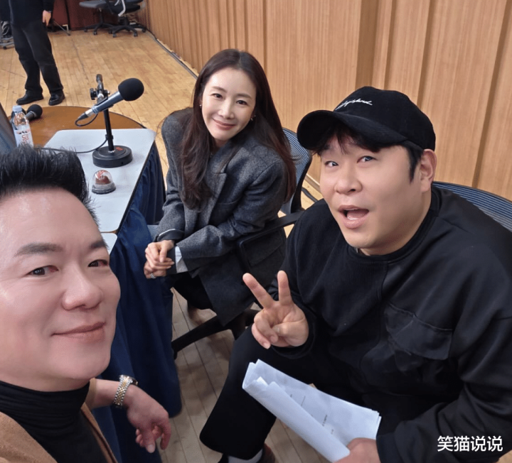 崔智友还晒出了她在录影棚里跟几位主持人的合照。照片中的她坐在椅子上,双手交握,对着镜头露出了甜美的笑容。