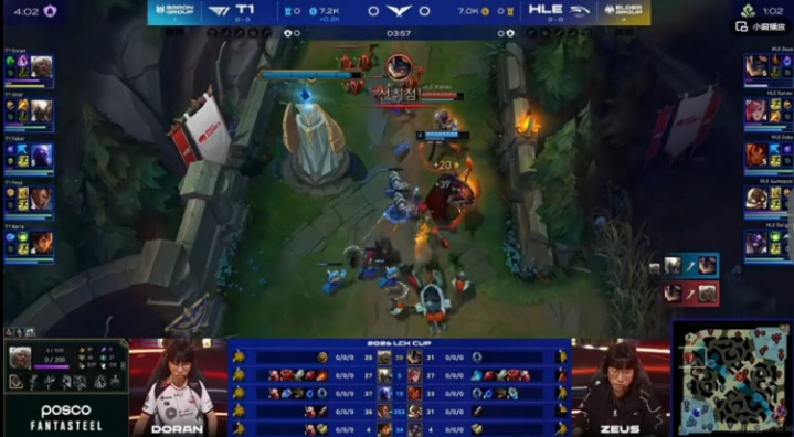 [3:55]HLE上野越上,Doran安蓓萨交闪拉扯,反蹲的Oner潘森支援到位,最终这波是双方上单互换,一血给到了Zeus兰博!