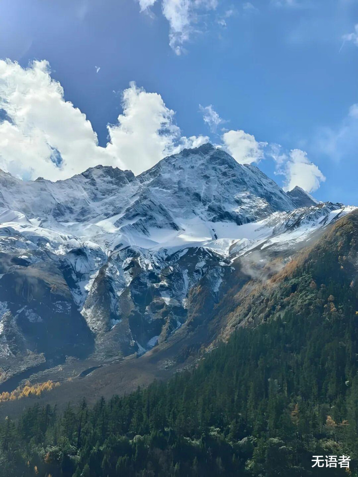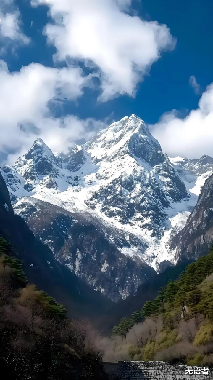 一片白云横亘山岭,仿佛将山峦截断,其轻柔与雪山的冷峻形成反差;而“半空飞瀑”如银练垂落,直击岩隈,水声轰鸣,气势磅礴。
