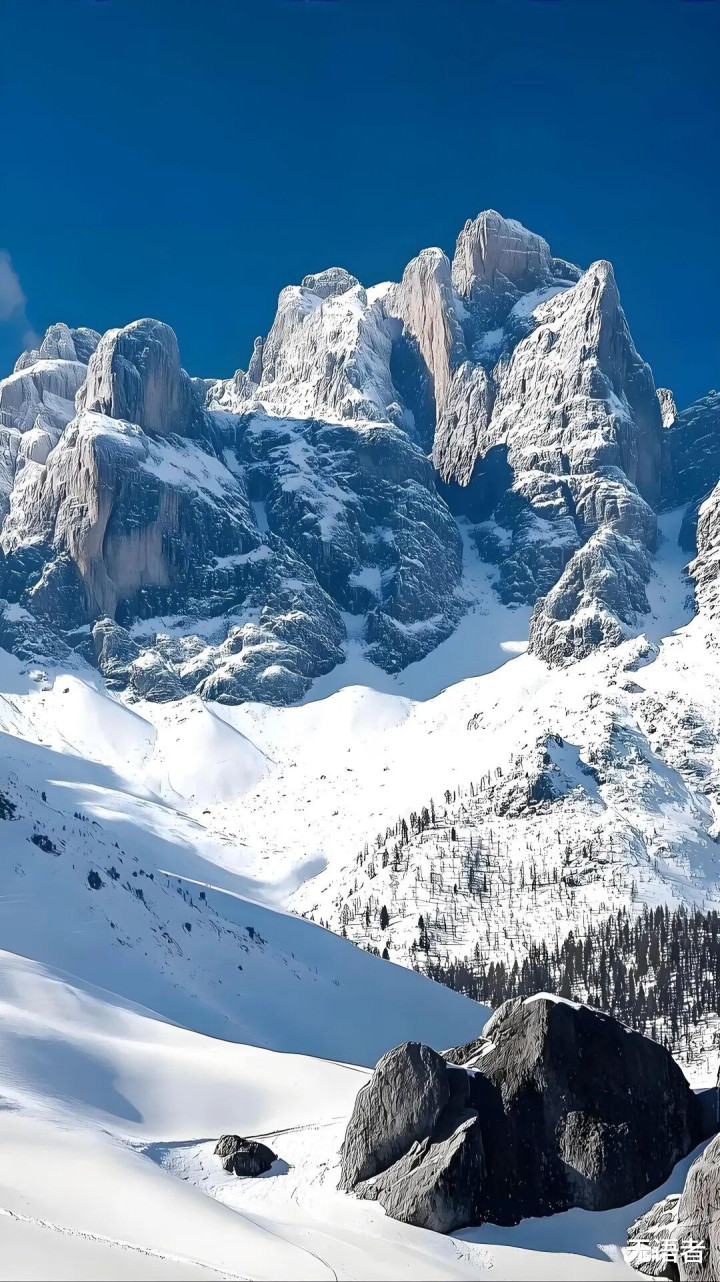 长松虬曲如龙蛇蛰伏,怪石嶙峋似猛兽蹲守,尽显粗犷野性;而细草柔嫩、奇花绚烂,如锦绣堆叠,为冷峻的雪山增添一抹柔美。