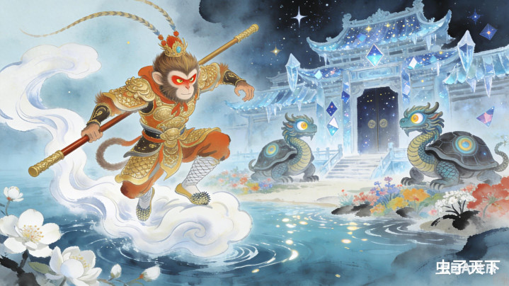悟空正要摘几朵花果山的猴子猴孙们尝尝鲜,忽见一处宫阙与众不同,那屋顶竟是以千年玄冰为瓦,墙体嵌满星斗碎片,门前立着两尊玄武雕像,眼睛还会转动!