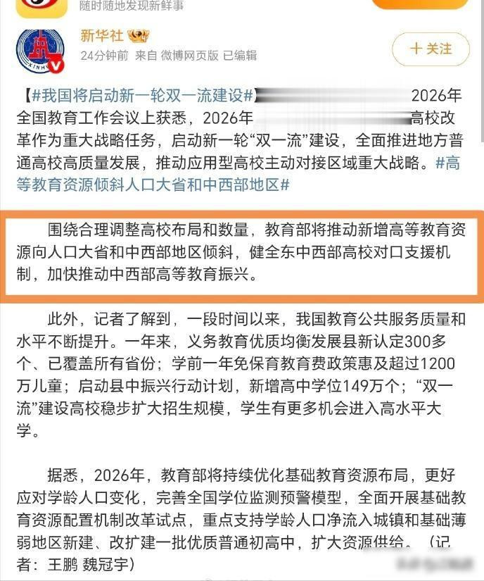 2026年的国家教育工作会议调整了方向,新一轮“双一流”建设不再只看成绩好坏,还要看高校能不能真正为地方发展提供支撑,特别是中西部地区,比如河南这样人口过亿、经济实力较强的大省,国家开始加大支持力度,教育部明确会向这些地区投入更多资源,还推动东部与中西部结对帮扶,目的就是防止东部地区发展太快,让中西部也能跟上前进步伐。