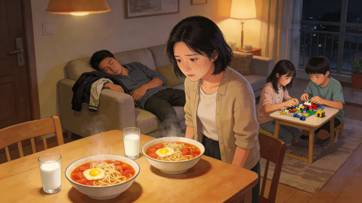 林慧迷迷糊糊睡了过去,再次醒来时,闻到一股淡淡的番茄香。她撑着身子坐起来,看见客厅的餐桌上摆着两碗番茄鸡蛋面,旁边还有一杯温好的牛奶。张磊坐在沙发上,头靠在椅背上睡着了,身上盖着一件小小的、明显是朵朵的外套。小宇和朵朵坐在一旁的小桌子上,正小声地拼乐高,没吵到任何人。