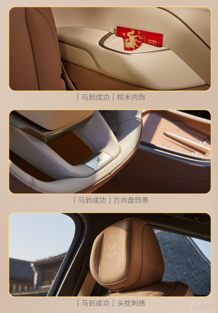 座舱内搭配棕色与米色双拼Nappa内饰,拥有“马到成功”专属头枕刺绣、方向盘饰条以及车机主题。内饰源于乐道“城市绿洲”设计理念,采用棕米上下分色环抱座舱。