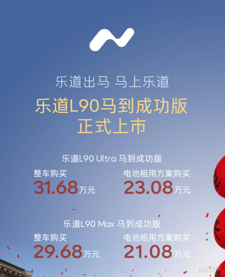 1月23日,乐道汽车正式推出L90马到成功版车型。新车基于现有L90Max和Ultra六座版本打造,标配价值38470元的专属定制套装,L90Max马到成功版整车售价29.68万元,电池租用方案为21.08万元;L90Ultra马到成功版整车售价31.68万元,电池租用方案23.08万元。
