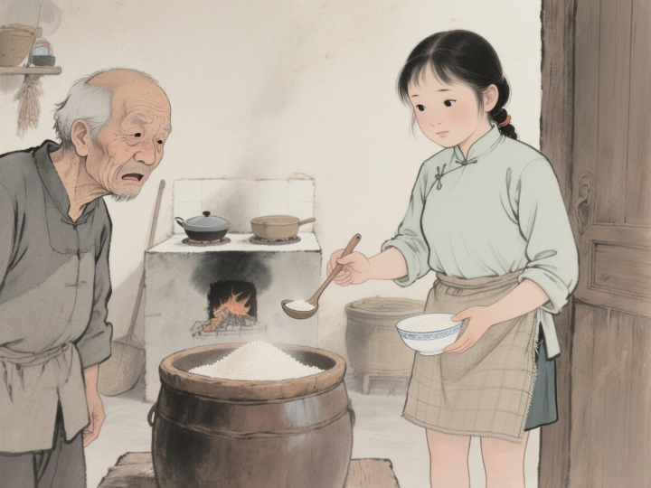 阿秀家里只剩小半碗米了,爹知道了定要发火。可看着老人干裂的嘴唇,她重重点头:“您等着,我这就回去煮。”