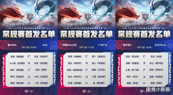 昨天的三场比赛分别是情久打滔搏、Hero打TTG、DRG打KSG,情久滔搏的首发较挑杯无变化,个人更看好滔搏。Hero首发五人组也没变,TTG新辅助变成了涵,DRG新辅助是呆呆,KSG推出的全新阵容有无言句号流浪,重点是下路双人组,射手辅助KSG全换了,选择让一笙带小将小屿,只要小屿表现还可以,风箫估计要一直替补!