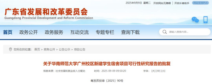 广东省《关于华南师范大学广州校区新建学生宿舍项目可行性研究报告的批复》(图源:广东省发展和改革委员会官网)