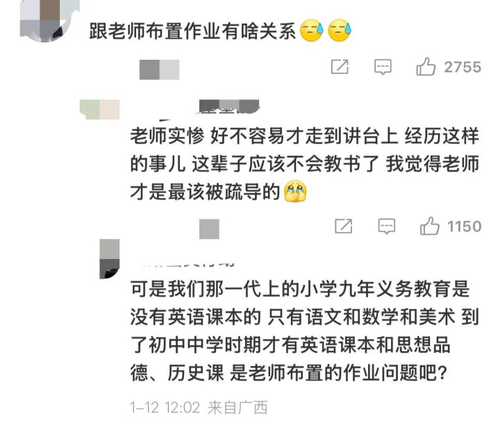 那位英语老师已经辞职了。报道说她“内心充满懊恼与委屈,不知如何才能自证清白”。一个老师要求学生完成作业,这是她的本职工作,可现在她却要背负这么大的心理负担。