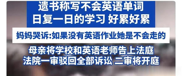女孩的妈妈把学校和英语老师告上了法庭,认为“如果没有英语作业,她是不会走的”。一审法院驳回了她的诉讼请求,现在要二审了。