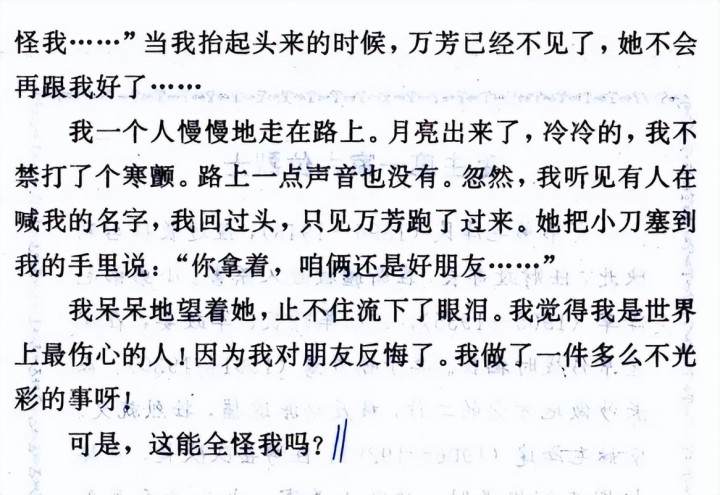 《羚羊木雕》的结尾,万芳把木雕还给了“我”,还安慰“我”说:“咱俩还是好朋友。”但“我”在回家的路上,哭得像个泪人。
