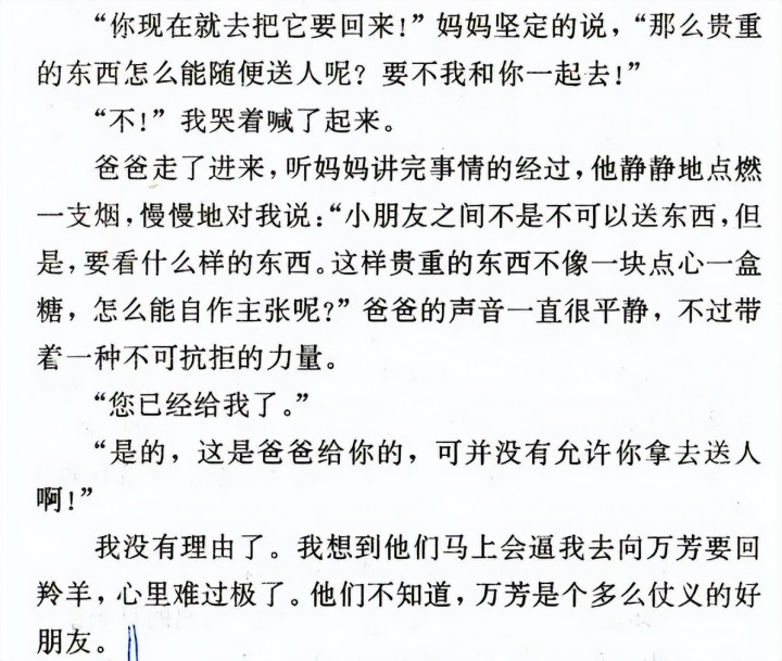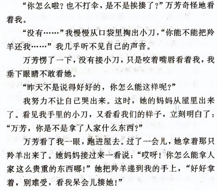 文中,“我”把父亲从非洲带回来的名贵羚羊木雕,送给了家境贫寒、却在冬天把外套借给“我”穿的好朋友万芳。父母得知后,大发雷霆,逼着“我”深更半夜去万芳家把东西要回来。